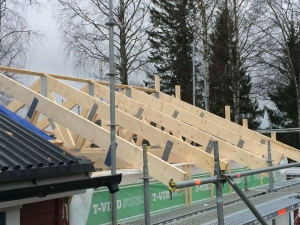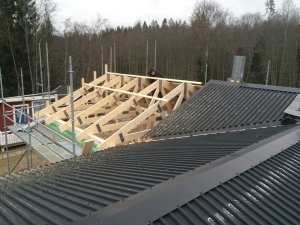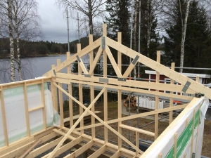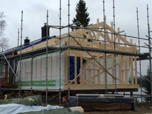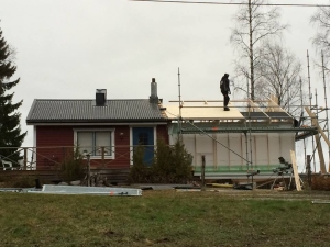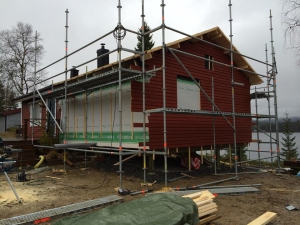 Här har vi gjort både en om- och tillbyggnad. Stomresning,samt nytt takställ, ny panel och även nya fönster på stugan.